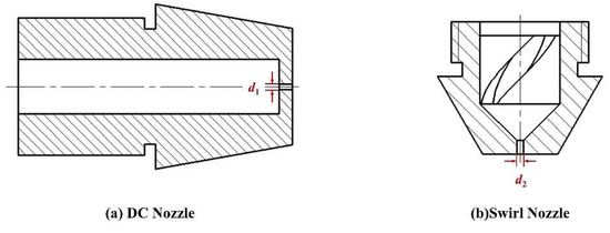 In order to investigate the atomization characteristics of different gelled fuels, three kinds of atomizers were designed for this paper: a DC nozzle, a swirl nozzle, and a self-excited oscillation nozzle. The DC nozzle and swirl nozzle are traditional atomizers, and they have their own advantages and disadvantages. The structure of the DC nozzle is a simple one, which is widely used in the combustion chamber of liquid rocket engines. The fuel behaves as a continuous liquid jet after ejecting from the nozzle outlet, which usually has a long penetration distance. However, the spray cone angle of the DC nozzle is typically small, and the atomization performance of the DC nozzle is generally poor. A swirl nozzle can have a better spray performance, with a larger spray cone angle, smaller droplet diameter, and more uniform droplet distribution. The disadvantage of the swirl nozzle is that the penetration depth is short, which brings the fuel mixing and combustion zone closer to the injection panel. The structure of the DC nozzle and the swirl nozzle used in this paper is shown in Figure 3. The outlet diameters of the DC nozzle and swirl nozzle are 0.42 mm and 0.46 mm, respectively. The swirl nozzle contains a cyclone, which has two 1 × 1 mm cyclonic flow grooves.