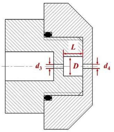 Based on the study by Jia et al. [19], the key structure parameters of the self-excited oscillation nozzle are d1 = 0.38 mm, D = 1.2 mm, L = 2 mm, and d2 = 0.44 mm. The structure of the self-excited oscillation nozzle is shown in Figure 4.