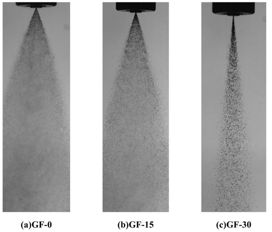 The atomization characteristics of different gelled fuels using swirl nozzles were also tested at the same volumetric flow rate of 7 mL/s. Figure 7 shows the spray images of swirl nozzles for three different gelled fuels at the same liquid volume flow rate. It is obvious that the atomization performance of the swirl nozzle is significantly better than that of the DC nozzle, which can produce a more uniform spray field for the gelled fuels containing different concentrations of nanoparticles. The centrifugal force causes the fuel to be ejected from the nozzle exit as a conical liquid film, which creates a larger spray cone angle than the DC nozzle. The conical liquid film is rapidly broken, forming a fine and uniform spray field. As can be seen in Figure 7, the increase in Al nanoparticle concentration makes the droplet diameter in the spray field larger, which can also be seen in the data from the laser particle size analyzer. The spray angles of GF-0, GF-15, and GF-30 are 42.2°, 34.504°, and 16.1°, respectively. It is more evident that the spray cone angle of the swirl nozzle gradually decreases with the increase in nanoparticles. This can be attributed to the increase in metal nanoparticles, which makes the fuel viscosity increase and the radial velocity of the nozzle decrease.