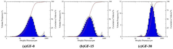 We tested the atomization performance of DC nozzles for different gelled fuels at the same volume flow rate. In the experiments, the volume flow rate of gelled fuels was controlled by changing the speed of the piston in the fuel tank, which is proportional to the electrical motor speed. The set volume flow rate is 7 mL/s, and the deviation of the actual flow rate from the set flow rate does not exceed 5%. Figure 5 shows spray images of different gelled fuels using DC nozzles at the same liquid volume flow rate. As can be seen in Figure 5, the atomization characteristics of the DC nozzle is similar for different types of gelled fuels, and a continuous cylindrical jet is formed when the gelled fuel is injected from the DC nozzle. Due to turbulence inside the liquid jet and the shearing effect at the gas-liquid interface, the droplets are stripped from the jet surface. However, the breakup length of the liquid jet produced by the DC nozzle is large, and large liquid clusters and filaments still exist downstream of the spray field. The large sized droplets are difficult to evaporate and burn quickly, which is harmful to engine performance. The spray angle of GF-0, GF-15, and GF-30 is 5.862°, 5.791°, and 5.574°, respectively. Table 2 shows the injection pressure and the mean droplet diameters for different gelled fuels. It is notable that the injection pressure of the fuel increases with the increase in solid particle content, while the SMD first decreases and then increases with the increase in solid particle content. This can be explained in that the apparent viscosity of GF-0 and GF-15 is approximately equal at a high shear rate, while the injection pressure of GF-15 is higher and the velocity of the liquid jet is large, so the jet breaks up more fully and therefore the SMD is smaller. The viscosity of GF-30 is much larger than that of GF-0 and GF-15, and has a greater effect on the liquid jet break-up, so the SMD of GF-30 is larger than that of the other two gelled fuels. In order to characterize the microscopic characteristics of the spray field, it is not sufficient to use the Sauter mean diameter D32 alone. The values of Dv50 and Dv90 are also listed in Table 2. Dv50 is the particle diameter corresponding to 50% of the volume distribution, Dv90 is the particle diameter corresponding to 90% of the volume distribution. As can be seen in the table, Dv50 is around 300 μm, which means that 50% of the droplets in the spray field are larger than 300 μm. Dv90 of the three gelled fuels are all above 600 μm, larger than the diameter of the DC nozzle exit 400 μm.