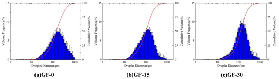 Figure 6 shows the droplet size distribution for different fuel types when using DC nozzles. The bar graph indicates the volume frequency of droplets whose size lie within a specific range. The solid line indicates the cumulative volume of droplets whose size is less than a specific value. As can be seen in Figure 6, the spray field of the DC nozzle has a higher percentage of large diameter droplets, and the largest volume frequency droplet has a diameter of approximately 500 μm. The droplet size distribution of GF-15 is a bimodal distribution, as predicted and seen in the spray images. In the spray field of the DC nozzle, there are both large liquid filaments and much smaller droplets which peeled off from the liquid jet. The number of these two sizes of droplets are similar to each other, so the droplet size distribution shows a bimodal distribution. Though the SMD are all around 100 μm for the three gelled fuels, the spray uniformity and fineness of the DC nozzle is not good, and a large number of un-atomized droplets still exist in the spray field. Overall, the atomization performances of DC nozzles for different gelled fuels are not satisfactory.