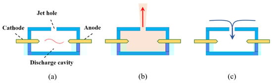 The conventional PSJA consists of an insulating closed cavity with a jet hole, a cathode, and an anode (Figure 1). Its operating process includes three stages: energy deposition, jet ejection, and inspiratory recovery [2]. The spark discharge produces a large sum of heat, and the air in the cavity is heated and rapidly expands. The jet is formed from the hole, and the external gas is backfilled to prepare for the next discharge [15].
