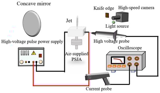 To study the discharge characteristics of the air-supplied PSJA and the flow characteristics in the discharge cavity, an experimental system was established for testing the internal flow field and discharge characteristics of the actuator cavity (Figure 3). The experimental setup primarily included a quartz vapor air-supplied PSJA, programmable high-voltage pulse power supply, discharge characteristic measurement system, and a high-speed schlieren measurement system.