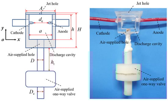 The quartz discharge cavity of the actuator was bonded with quartz glass of good light transmission performance, and the discharge cavity had a flat rectangular shape. The thickness of the light-transmitting side wall of the cavity was only 1 mm, which is convenient for the schlieren system to measure the gas flow state. The jet and filling holes were in the middle of the upper and lower sides of the discharge cavity, respectively. Electrodes of the actuator were located on the left and right sides of the discharge cavity.