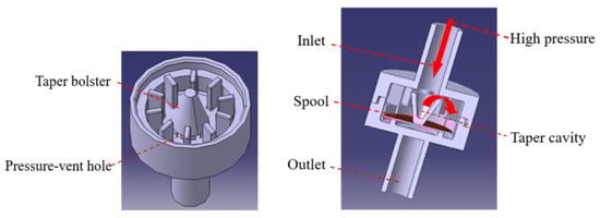 The one-way air supply valve primarily comprises an inlet end, spool, and outlet end (Figure 5). It was found that the spool of the one-way valve was deformed and leaked air because the response speed of the silicone spool of the valve could not meet the required air supply frequency for the experiment [26]. Therefore, a special design of the one-way valve structure was carried out to enhance the air supply effect of the one-way valve. The valve core support structure inside the outlet end was designed as a conical boss, and a hole was made at the bottom of the boss to allow gas to enter and exit [27]. The conical boss has a buffering effect on the reverse airflow while supporting the spool, and the reverse airflow that originally directly impacts the spool acts on the inner surface of the conical cavity, effectively preventing the high-pressure airflow to strike the spool.