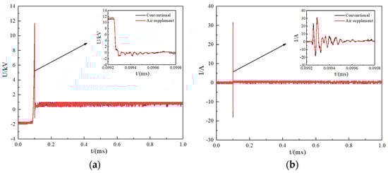 When the gas-filled actuator is in the effective frequency band, air supplement excitation can increase the peak voltage and current of the actuator discharge. In the conventional excitation state, the discharge peak voltage of the actuator was 11.3 kV and peak current was 20 A (Figure 11). Whereas under supplement excitation, the peak voltage was 12.1 kV and peak current was 25.5 A. Thus, compared with the conventional excitation, the discharge peak voltage of the actuator increased by 0.8 kV, corresponding to a 7.1% increase, and the peak current increased by 5.5 A, corresponding to a 27.5% increase.