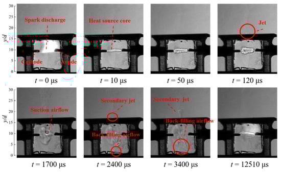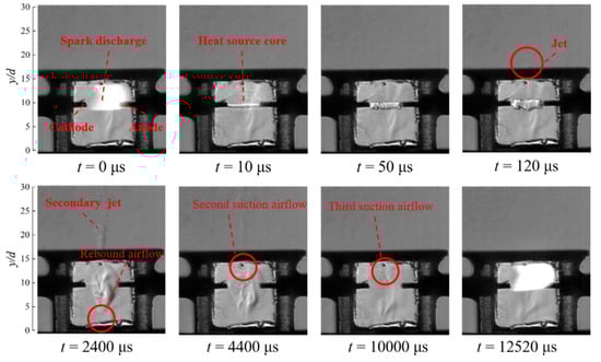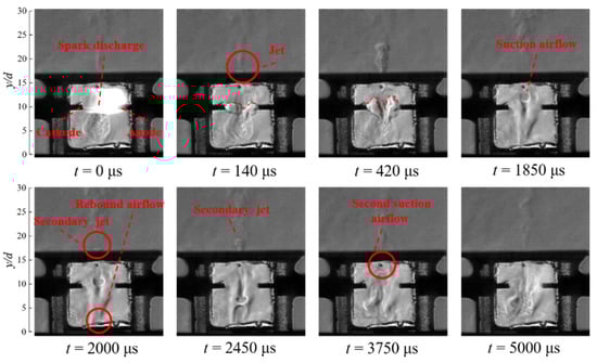 The flow-field state in the cavity under a conventional excitation state is shown in Figure 8. The discharge process and jet generation process were similar to those under the air supplement excitation state; however, at t = 1750 μs, a secondary jet appeared. Compared with the air supplement excitation state, the secondary jet appeared earlier and faster in the conventional excitation state.