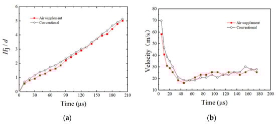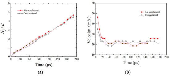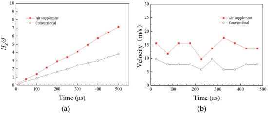 When f = 200 Hz, the single-cycle discharge energy was 0.408 and 0.485 mJ in the conventional and air supplement excitation states, respectively, i.e., the discharge energy increased by 18.9%. As abovementioned, the energy used to generate the synthetic jet increased; consequently, the dimensionless height of the jet front was higher under the air supplement excitation state, the jet front moved faster, and the jet performance improved (Figure 11).