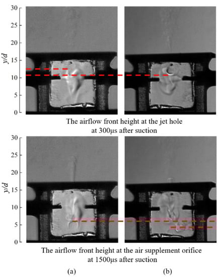 Comparison of the suction airflow front of the jet orifice at f = 200 Hz: (a) conventional excitation; (b) air supplement excitation.
