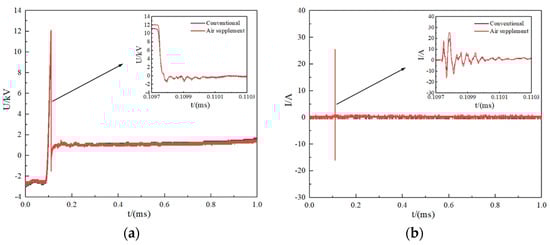 When f = 80 Hz, the air-supplied actuator was in an invalid frequency band, and the air supplement excitation could not improve the discharge parameters of the actuator (Figure 6). In the conventional excitation state, the discharge peak voltage of the actuator was 11.3 kV and the peak current was 31.5 A. The peak voltage was 11.7 kV and peak current was 30 A under air supplement excitation. The peak voltage and current of the actuator discharge did not significantly change under the two excitation states.