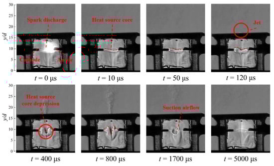 The core of the heat source reflects the heating effect of discharge energy on the gas in the cavity. When the actuator operated continuously in the effective frequency band, the heat source core produced a clear depression during an expansion (Figure 12 and Figure 13). This depression occurred in the upper part of the heat source core, thus inhibiting the normal upward expansion of the heat source core. This, in turn, affected the production of the jet and reduced the jet’s velocity. The depression gradually increased with the expansion of heat source core, and continuous development caused the heat source core to completely separate along the depression.