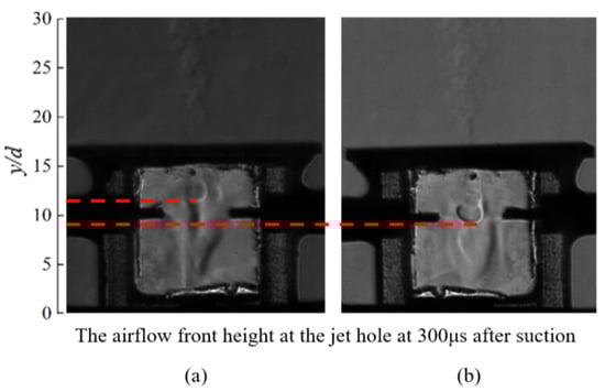 From the qualitative analysis of the ripple shadow image (Figure 15), after 300 μs of the suction, the airflow front height at the jet hole is higher in the air supplement excitation state compared with the conventional excitation state. Compared with the conventional excitation, the dimensionless height of the jet-hole suction airflow is significantly higher in the air supplement excitation state (Figure 16a), and the gap becomes more distinct. The overall velocity of the suction airflow is larger than that of the conventional excitation state, and at t = 320 μs, the speed of the suction airflow in the air supplement excitation state is nearly three times that of the conventional excitation state. This indicates that the pressure difference between the inside and outside of the actuator cavity is greater under the condition of air supplement excitation [15], which enables rapid air suction backfill through the jet orifice. In addition, a comparison of the inspiratory duration in the inspiratory recovery process revealed that the inspiratory duration of the actuator was only in the air makeup state once, whereas the inspiratory duration of the actuator in the conventional state required two or even three times to complete the inspiratory recovery process. This indicates that the inspiratory recovery effect can be improved by supplementing air via a one-way valve. When air is supplemented, the inspiratory recovery of the actuator is faster, and the gas state can be fully recovered to the initial state. This is helpful for the actuator to maintain a continuous and stable high-speed jet under the continuous high-frequency working state and can improve the saturated working frequency of the actuator to avoid premature ‘misfire’.