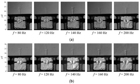 A transverse comparison of schlieren images in the cavity under different frequencies and working conditions at t = 400 μs, as shown in Figure 17, was performed to observe the difference in the influence of the heat source core on the depression. Evidently, when the working frequency was the same, the influence of the depression on the expansion process of the heat source core under air supplement excitation was weaker than that under conventional excitation. In addition, the initial frequency (140 Hz) of the heat source core defects in the air supplement excitation state was higher than that in the conventional excitation state (120 Hz). In general, with an increase in the working frequency of the actuator, the heat source core was significantly affected by the depression.