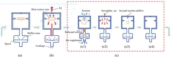 Inner flow model of the air-supplied actuator in the invalid frequency band: (a) spark discharge; (b) jet ejection; (c) inspiratory recovery: (c1) first suction (c2) secondary jet (c3) secondary suction airflow (c4) return to initial state.