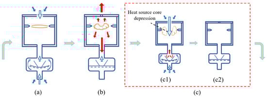 Based on the flow evolution process in the cavity of the actuator obtained from the abovementioned invalid and effective working frequency bands, the internal working mechanism of the air-supplied PSJA was clarified, and the working mechanism models of the actuator at different working frequency bands were determined, as shown in Figure 18 and Figure 19.