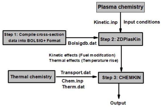 Numerical analyses were conducted using two solvers: ZDPlasKin (0D Plasma kinetic solver) [18] and CHEMKIN (Chemical kinetic solver) [19]. The methodology is shown in Figure 1 and explained in [13]. ZDPlasKin was used to analyze the kinetic and thermal effects of NSPD in CH4/H2/Air mixture. BOLSIG+ was linked to ZDPlasKin to predict the temporal evolution of excitation states and the reactions producing free radicals/active particles. It has been assumed that the non-equilibrium plasma created from a CH4/H2/air mixture at atmospheric pressure is uniformly distributed, which is a similar assumption to what was previously executed in [13]. Although the nanosecond pulsed plasma combustion process is three-dimensional and not homogeneous, we used a simplified homogeneous model. To investigate the effects of plasma CH4/H2/air products on flame speed and flammability limits, we used the plasma products of CH4/H2/air as the inlet domain of the reactor.