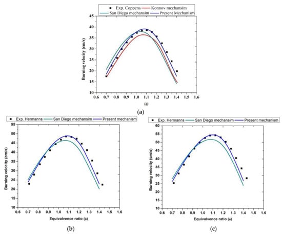 Validation: predicted values of burning velocities of CH4/H2/Air mixture with a H2 content of (a) 5%, (b) 30% and (c) 40%.
