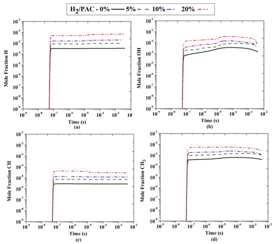 Temporal evolution of (a) H, (b) OH, (c) CH, (d) CH3 concentrations at different contents of H2 in methane/air mixture using fixed plasma actuation conditions.