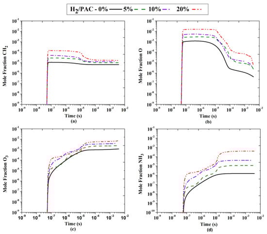 Temporal evolution of (a) CH2, (b) O, (c) O3, (d) NH3 concentrations at different contents of H2 in methane/air mixture using fixed plasma actuation conditions.