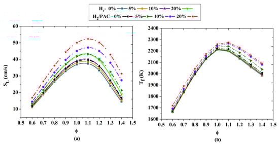 Comparison of (a) flame speed and (b) flame temperature at various equivalence ratios using different H2 contents with or without NSPD.