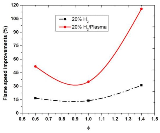 Flame speed improvement was significantly higher at lean conditions and low flame temperatures. For instance, at an equivalence ratio of 0.8, 20% H2/Plasma resulted in a flame speed of 37 cm/s at a flame temperature of around 2040 K. This same flame speed was also observed in the case of 0% and 5% H2 with a flame temperature close to 2200 K, meaning that high flame speed can be achieved at lean conditions and low flame temperatures, reducing NOx emissions. Figure 7 shows the comparison of flame speed improvement at lean, stoichiometric, and rich conditions with xH2 = 0.2 with or without NSPD. The improvement in flame speed was higher at lean conditions (equivalence ratio of 0.6) with the addition of xH2 = 0.2, reaching 15%. Combining xH2 = 0.2 with plasma discharge significantly increased flame speed by more than 50%. Furthermore, the combination of H2 blend (xH2 = 0.2) and NSPD improved the flammability limit to equivalence ratio 0.35 at a flame temperature of 1350 K, allowing for reduced fuel consumption.