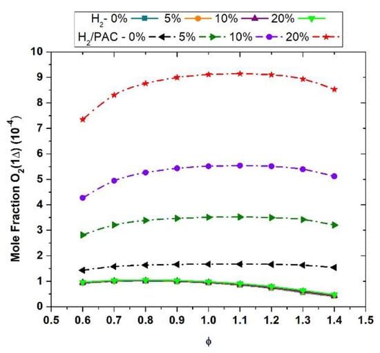 Comparison of molecular excited species O2(1∆) at various equivalence ratios using different H2 contents with or without NSPD.