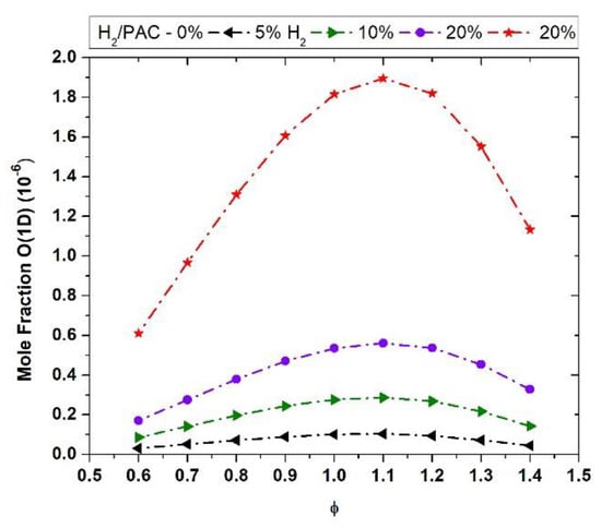 Comparison of atomic excited species O(1D) at various equivalence ratios using different H2 contents with NSPD.