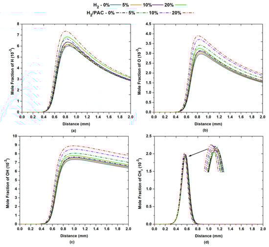 Mole fraction profiles of (a) H, (b) O, (c) OH, and (d) CH3 with different blends of hydrogen without or with NSPD.