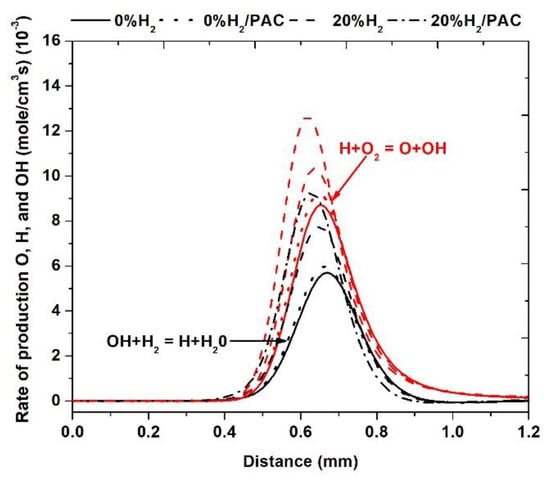 Figure 11 shows the production rate of Equations (6) and (7) with xH2 = 0 and xH2 = 0.2 with/without NSPD. The rate increased and the peak shifted upstream with hydrogen addition, but with xH2 = 0.2 and plasma, a significant impact was seen.