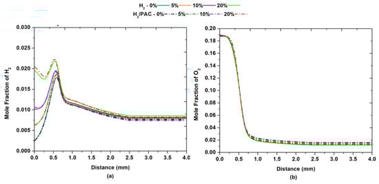 H2 and O2 mole fractions change with hydrogen blends and NSPD, shown in Figure 12. H2 transforms from intermediate species to initial reactant in methane flames with xH2 ≥ 0.2 and NSPD. H2 starts reacting upstream in xH2 = 0.2, confirmed by [36]. H2 promotes combustion and moves the reaction region towards upstream due to its higher reactivity than CH4.