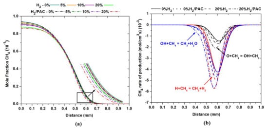 Figure 13a illustrates the mole fractions of CH4 in different H2 blends with or without the NSPD. The addition of H2 and NSPD leads to a decrease in CH4 mole fraction, possibly due to the high reactivity of H2 and lower CH4 concentration. The oxidation of CH4 greatly increased and its profiles were shifted towards the upstream sides. CH4 was mainly consumed by reactions with active particles O, H, and OH. The dominant CH4 consumption reactions are listed below.