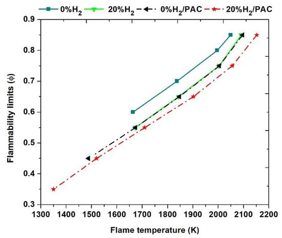 Finally, the lean flammability limit is discussed as the minimum equivalence ratio for flame propagation. Figure 14 shows the lean flammability limit using hydrogen contents XH2 = 0 and XH2 = 0.2 with or without NSPD. The flammability limit remained at ϕ = 0.6 without H2 and plasma but improved to ϕ = 0.5 with the addition of XH2 = 0.2. Plasma discharge had a significant impact on the flammability limits, with ϕ = 0.45 at flame temperature about 1500 K.