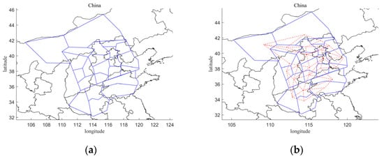 - Intensity, as expressed in Equation (1):where represents the set of sectors adjacent to sector , represents the total number of flights between sector and sector that receive ATC services within sector , and represents the overall traffic volume of sector . This last metric is considered one of the key indicators in the study of air traffic congestion [24].