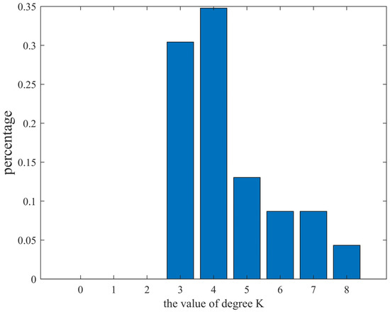 - The degree of a node, denoted as , reflects the node’s significance in the network and is defined as the number of edges connected to it. In the context of the airspace sector network, the degree of sector represents the number of sectors that are geographically adjacent and have a direct air traffic connection with sector [23]. This study expands the research scope of aviation networks by applying complex network theory to ATC sectors, providing a complementary perspective to previous studies on aviation and route networks.