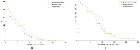 - The invulnerability of various sectors under different attack strategies is evaluated, and critical sectors are identified by considering the network’s global efficiency and the relative size of its connected component.