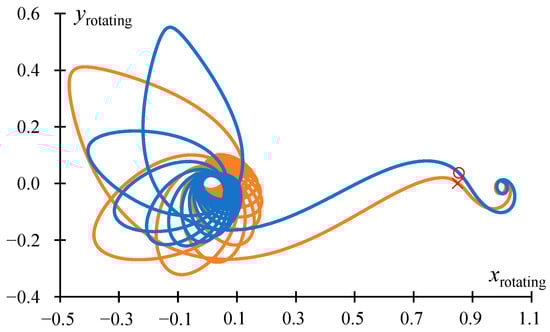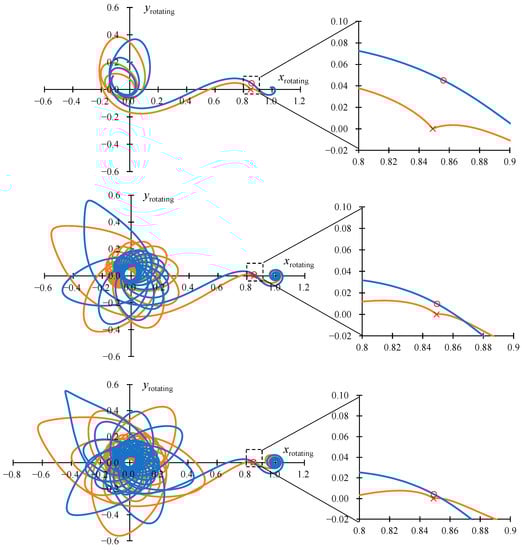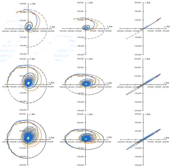 Figure 1 shows the projections of the optimal trajectories, which have the angular distance of 5, 20, and 35 revolutions, with an optimal junction point and with a junction of the geocentric and selenocentric segments at the EML1 point in the inertial coordinate system J2000. In Figure 1 and everywhere else in this article, the position of the EML1 libration point is indicated by the red marker “×”, and the position of the optimal junction point is indicated by the red circle. The motion of the Moon is indicated by the dashed gray line. Everywhere else in this article, the solution associated with the trajectory with an optimal junction point is indicated by a blue line, and the trajectory with an intermediate EML1 rendezvous by an orange line.