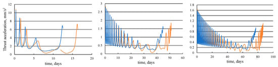 Figure 3 presents the dependences of the optimal thrust acceleration magnitudes on time for the trajectories with an angular distance of 5 (on the left), 20 (on the middle), and 35 (on the right) revolutions. The solution with an optimal junction of two segments makes it possible to ensure the continuity of the optimal control program (thrust acceleration vector) at the junction point and the smooth connection between the geocentric and selenocentric segments of the trajectory. The trajectories with an intermediate EML1 rendezvous, on the contrary, have fractures and discontinuities in the control program at the EML1 point (Figure 2 and Figure 3).