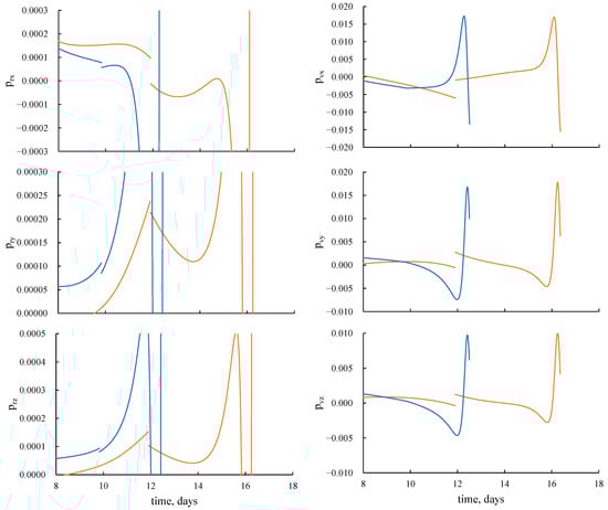 Figure 4 presents the time dependences of the adimensional values of costate variables to the vectors r and v on the 4-revolution LP-trajectory to the Moon. For the trajectory with an intermediate EML1 rendezvous (orange line), there is a discontinuity in all six costate variables, since two separate optimization problems for the geocentric and selenocentric segments of trajectory are being solved. In the case of the trajectory with an optimal junction of two segments (blue line), the dependences of the costate variables to the components of the velocity vector pv are continuous, but the costate variables to the components of the position vector pr have a discontinuity λ1·r+/r+ at the junction point.