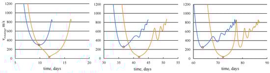 The time dependences of velocity in the rotating coordinate system on the 5-, 20-, and 30-revolution trajectories with an optimal junction point and with the intermediate EML1 rendezvous are presented in Figure 5. The deviations of the velocity magnitude Δvrotating in the rotating coordinate system from the velocity magnitude of the libration point EML1 at the junction point of two segments of trajectory are 266.7827 m/s for a 5-revolution trajectory, 224.6906 m/s for a 20- revolution trajectory, and 218.0903 m/s for a 35-revolution trajectory