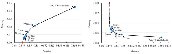 Figure 6 presents the positions of the optimal junction points of the geocentric and selenocentric segments onto the XY and XZ planes in the rotating coordinate system for the considered trajectories with an angular distance of 5 to 35 revolutions. On the graphs, the libration point is indicated by the red dot, and the optimal junction points of the two segments are indicated by the blue squares. The optimal junction point approaches the libration point EML1 as the total number of revolutions increases (dashed trend lines in Figure 6).