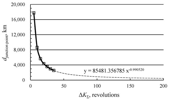 Figure 7 presents the dependencies of the distance djunction point between the optimal junction point and the libration point EML1 on the total number of revolutions of trajectories in the inertial coordinate system. In this Figure, the obtained values of distance between two points are indicated by the black squares. The graph shows the dependence of djunction point on the total increment value of the angular variable K with extrapolation to the region of large values of the angular distance (dashed line).