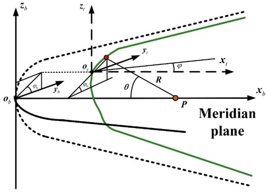 With the occurrence of head ablation, the instantaneous coordinate system gradually changes. A point that cannot be ablated inside the vehicle is selected as the origin of the spherical coordinate system, and is the polar diameter from the origin to the ablation surface; and are the spherical center angle and meridian angle, respectively. Therefore, the relationship between the instantaneous coordinate system and spherical coordinate system is as follows: