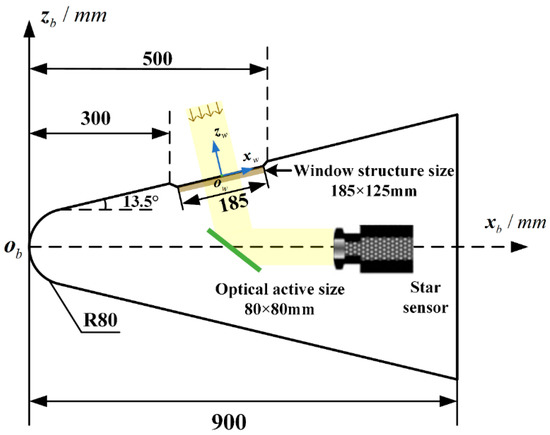 This paper uses the hypersonic vehicle structure employed in previously published literature [9], as shown in Figure 3. and represent the vehicle body coordinate system and window coordinate system, respectively.