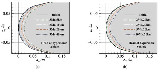 (a) Ablation profile at the same velocity and different altitudes; (b) ablation profile at the same altitude and different velocities.