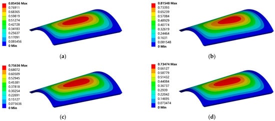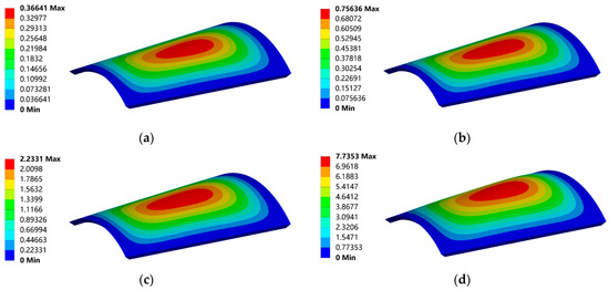 Thermal deformation (mm) of the optical window at the same altitude and different speeds: (a) 2 Ma, 20 km; (b) 3 Ma, 20 km; (c) 5 Ma, 20 km; (d) 10 Ma, 20 km.