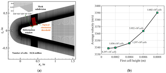 In this study, the commercial software Ansys Fluent 2021R2 was used to simulate a high-speed flow field. Mesh generation is required before the flow field simulation. In order to more clearly reflect the impact of ablation, the grid was densified at the ablation boundary. Taking the simulation condition of 10 Ma and 20 km (as shown in Table 1) as an example, the grid distribution of the hypersonic vehicle is shown in Figure 8a.