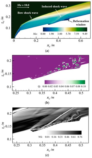 High-speed flow field under the condition of 10 Ma and 20 km: (a) Mach number of high-speed flow field; (b) the vortex structure of high-speed flow field; (c) the numerical schlieren of high-speed flow field.