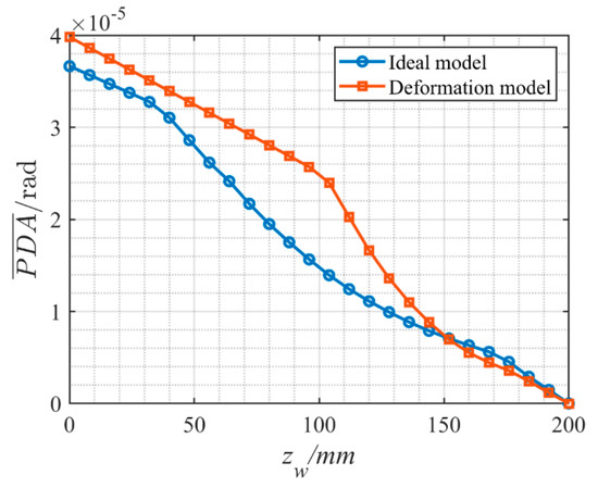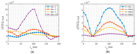where and are the simulation results of the aero-optical offset angle under the ideal model and ablation deformation model, respectively. Additionally, the simulation results under different flight conditions are shown in Figure 12.