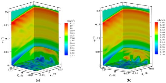 Figure 12 also shows that the offset angle error and transmission distance caused by the different models actually satisfy the nonlinear relationship. The lower position in the curve is because it is in the vicinity of the shock wave, which will produce an inflection point. With the aggravation of the ablation in an aerodynamic heating environment, the final offset angle error also increases. The relative error is obtained according to the ratio of the error and . In addition, based on the average value of the relative error under seven different simulation conditions, it is estimated that the impact of the ablation deformation on the final aero-optical effects distortion is about 7.2%. To more comprehensively analyze the aero-optical effects in the thermal environment, simulations were conducted for different flight conditions, which are shown in Figure 13 and Figure 14. There are 40,000 LES simulation steps, and the simulation time is 4 ms.