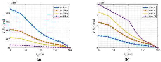 The offset angle error under ideal model and ablation deformation model: (a) the same altitude 20 km and different speeds (2 Ma, 3 Ma, 5 Ma and 10 Ma); (b) the same speed 3 Ma and different altitudes (5 km, 10 km, 20 km and 40 km).